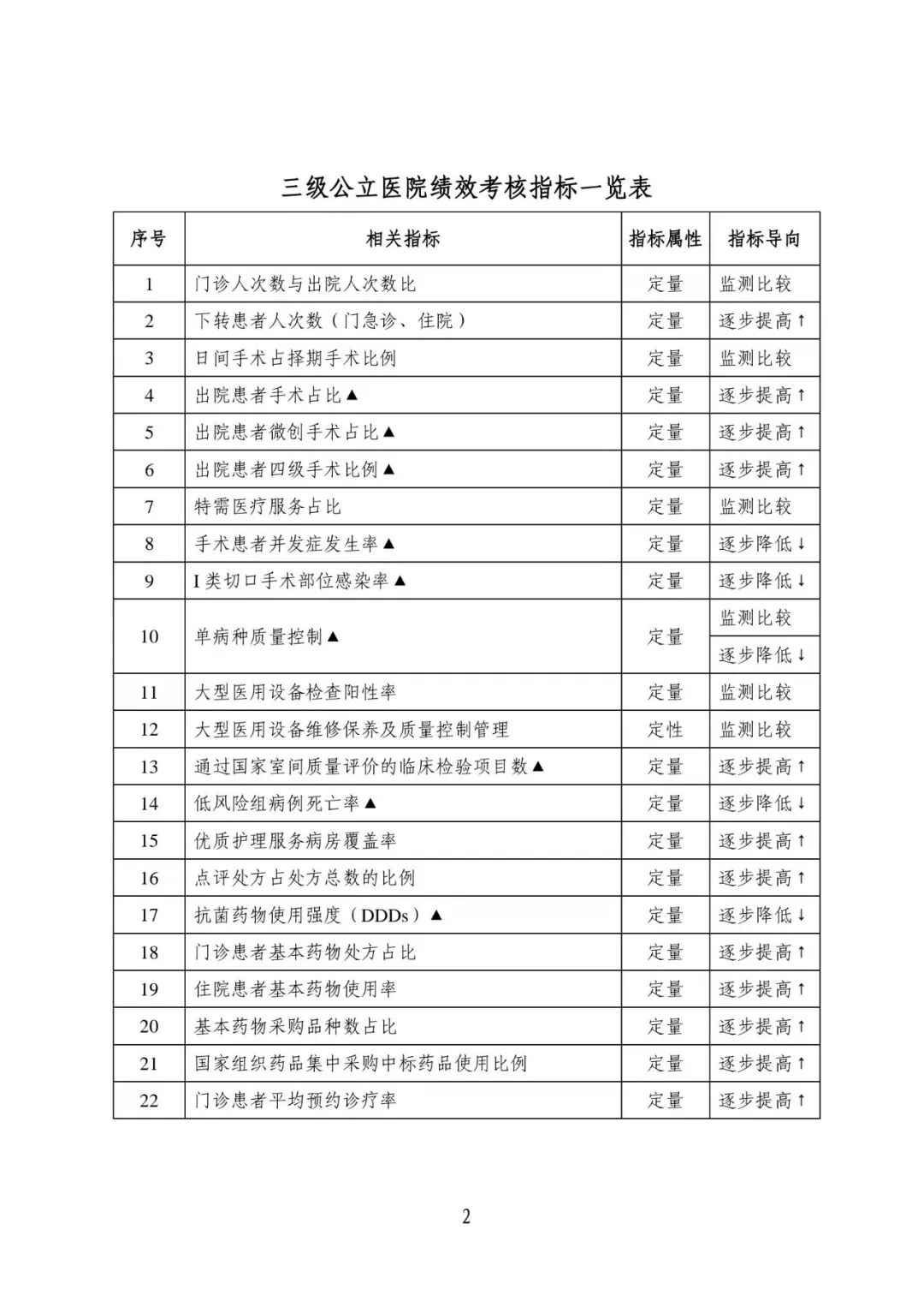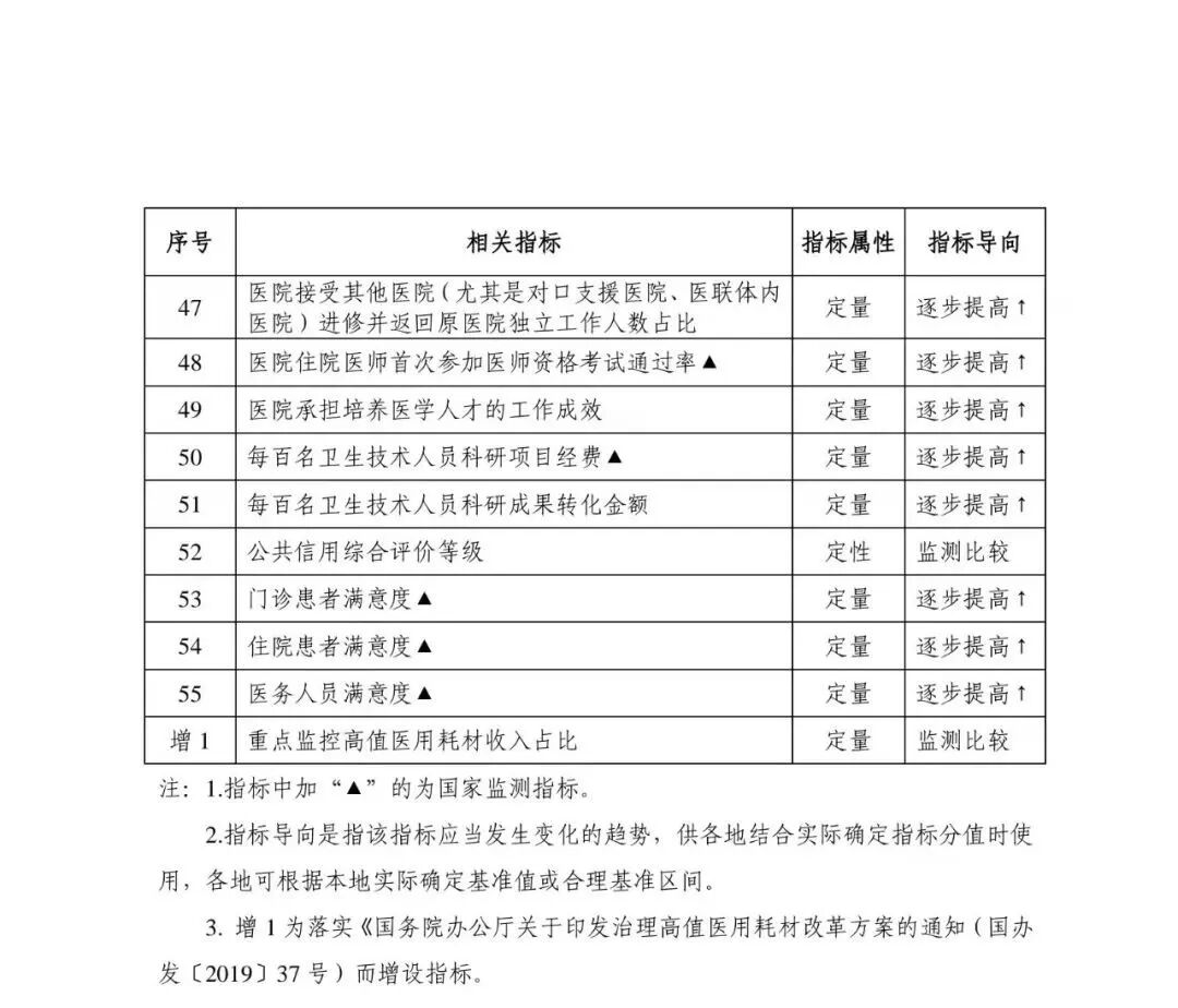 为贯彻落实《国务院办公厅关于加强三级公立医院绩效考核工作的意见》要求,保证三级公立医院绩效考核工作规范化、标准化、同质化,国家卫生健康委于2019年组织制定了国家三级公立医院绩效考核操作手册。根据实际工作需要和最新政策要求,对操作手册进行了修订完善,形成了《国家三级公立医院绩效考核操作手册(2022版)》。三级公立医院绩效考核指标体系中,包含一级指标 4 个、二级指标 14个、三级指标55个、新增指标1个。新增指标为重点监控高值医用耗材收入占比。