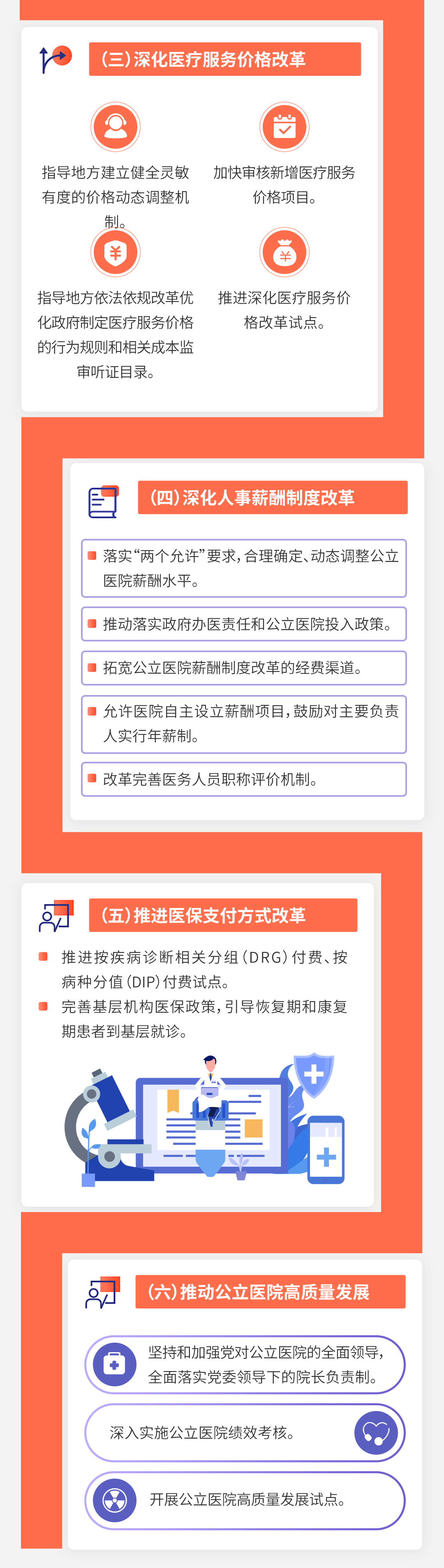 (五)推进医保支付方式改革。推进按疾病诊断相关分组付费、按病种分值付费试点,促进精细管理,适时总结经验并向全国推广。完善基层机构医保政策,引导恢复期和康复期患者到基层就诊。(国家医保局、财政部、国家卫生健康委、国家中医药局等按职责分工负责)