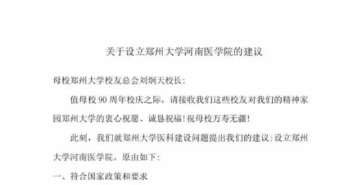 2018年下半年,郑州大学90周年校庆期间,一封题为《关于设立郑州大学河南医学院的建议》广为流传,文章从设立郑州大学河南医学院符合国家政策和要求、符合国际高等医学教育规律、保护母校郑州大学的历史品牌、显示郑州大学悠久历史和辉煌成就、凝聚海内外九十年形成的校友感情和建设母校双一流大学巨大力量、国内同类高校的共同做法等六个角度提出建议。